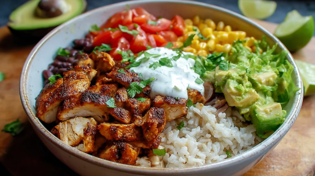 Chicken Burrito Bowl grilled chicken served over rice with beans, corn, avocado, and fresh toppings in a colorful healthy bowl